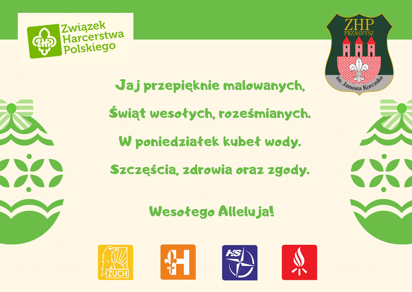 Kochane zuchy, harcerze, instruktorzy, życzymy Wam świąt pełnych wiary w lepsze jutro, miłości i spokoju, a także radości mimo wszelkich przeciwności oraz nadziei, że już niedługo spotkamy się na harcerskim szlaku! Komenda Hufca ZHP Przasnysz…